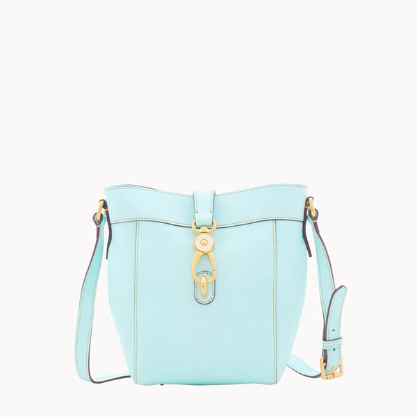 Channel your inner equestrian with our delicate, pale blue Florentine Sadie Feed Bag. This streamlined design is sure to draw admiration, and the signature lock closure ensures all of your belongings will remain safe and secure inside. This crossover bag combines the convenience of a bucket bag with the attractiveness of a tote, making it a solid choice to complement any spring outfit.
